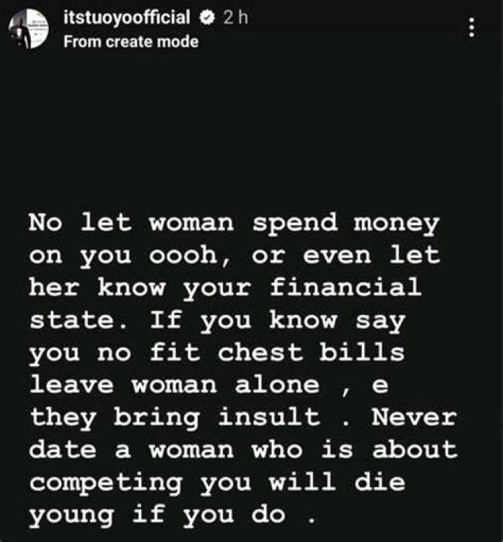 In an Instagram story post, he encouraged them not to let a lady to burn through cash on them or even know their monetary potential.
