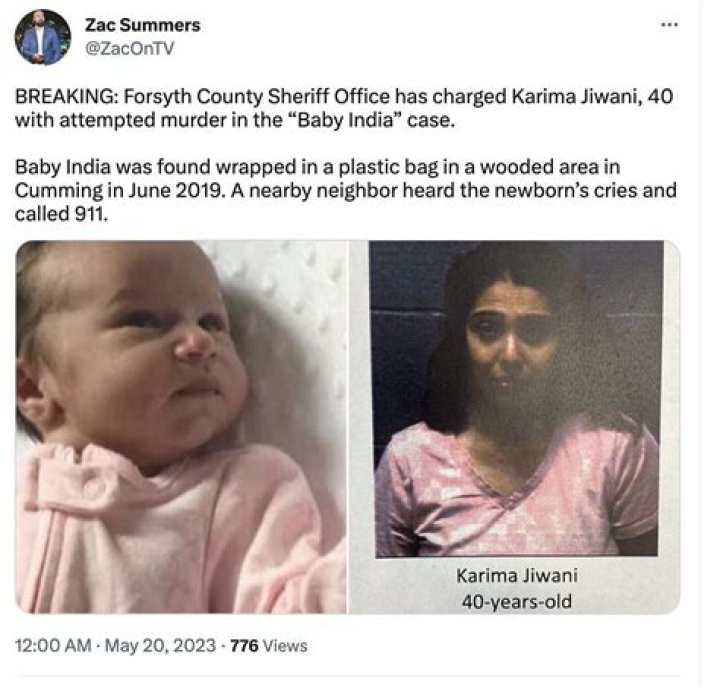 Almost four years after a newborn young lady named Child India was found in a plastic sack in the forest of the northern piece of Georgia, the police were fruitful in distinguishing and capturing Karima Jiwani, the mother of the kid. The 40-year-old was captured on Thursday, May 18, 2023. The blamed has been accused of criminal endeavors to perpetrate murder, brutality to kids in the principal degree, exasperated attack, and crazy surrender.