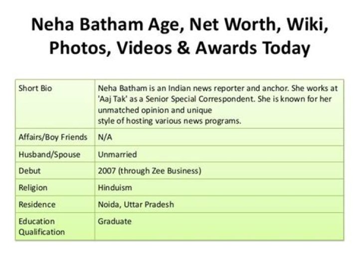 Neha Batham Profession Not long after completing her schooling, Neha joined Zee Business Channel as a columnist. Subsequent to working there for two or three months, Neha went to another news channel, News24. Here she stands firm on an imperative footing on the Business Board. Then, at that point, she worked at B.A.G. Films and Media Restricted for a brief time frame and joined Aaj Tak as a Reporter in 2013. All things considered, she showed up in Aaj Tak and presently filled in as a Senior Exceptional Reporter.