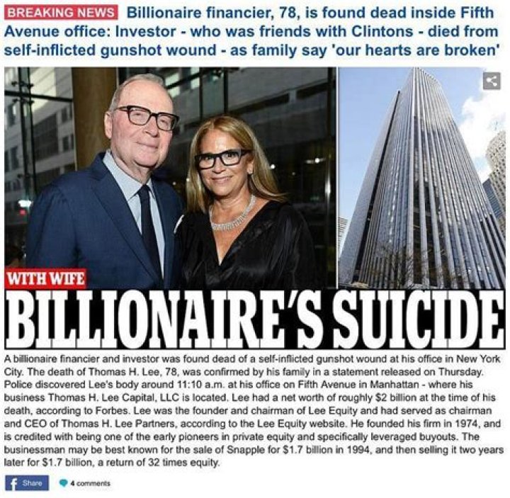 Notable money manager Thomas H. Lee was as of late found dead at his office with a self-incurred shot injury. He was found at around 11 am and was affirmed dead on the spot.