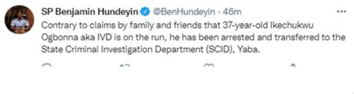 “In opposition to claims by loved ones that 37-year-old Ikechukwu Ogbonna also known as IVD is on the run, he has been captured and moved to the State Criminal Examination Division (SCID), Yaba.”he tweeted.